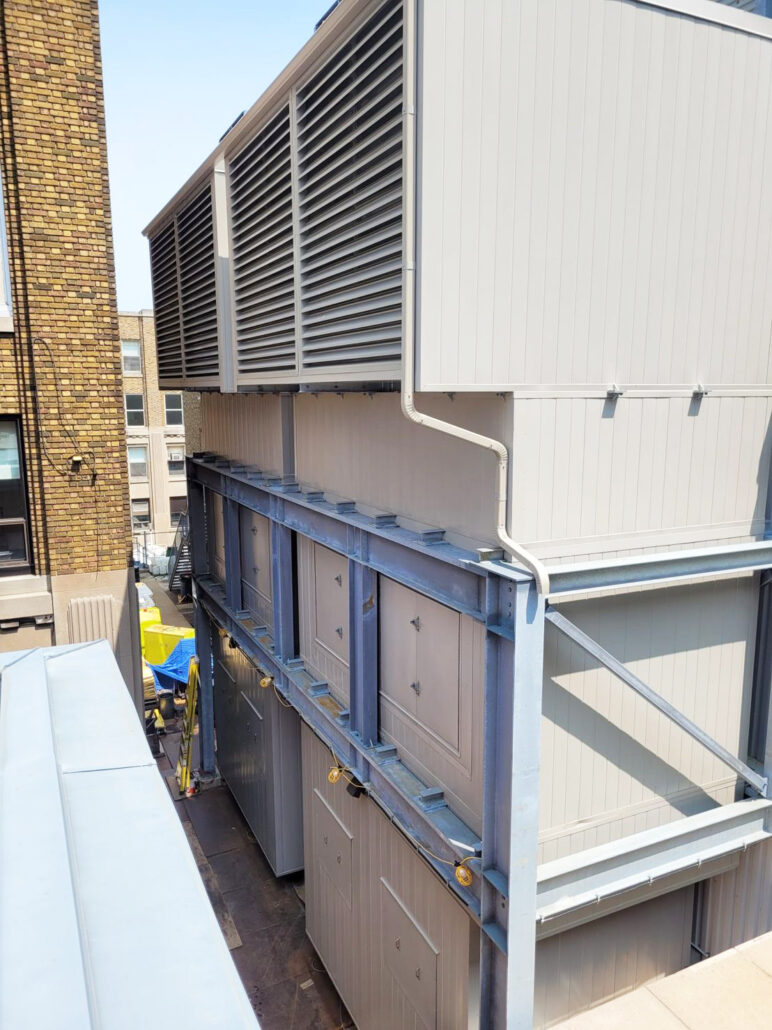 Similarly, rooftop penthouses around cooling equipment help prevent sound from reflecting off building facades and carrying into upper-floor residences across the street.